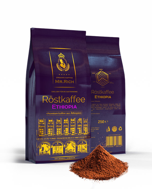 Ground arabica from the Ethiopian highlands forms the basis of Mister Rich Ethiopia's coffee. Mister Ethiopia guarantees a unique pleasure, is spicy and full in taste, with balanced acidity and a pleasant floral note.